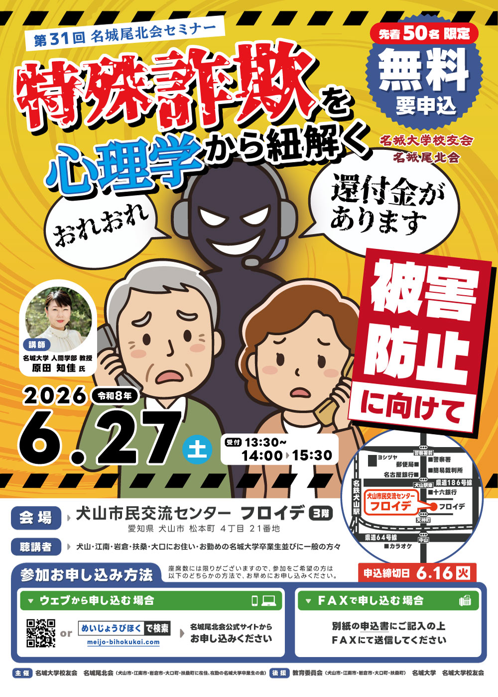 尾張北部地域(一宮市、江南市、犬山市、小牧市、岩倉市、大口町、扶桑町など)に在住または勤務されている、名城大学にゆかりのある皆さまのご参加をお待ちしています。